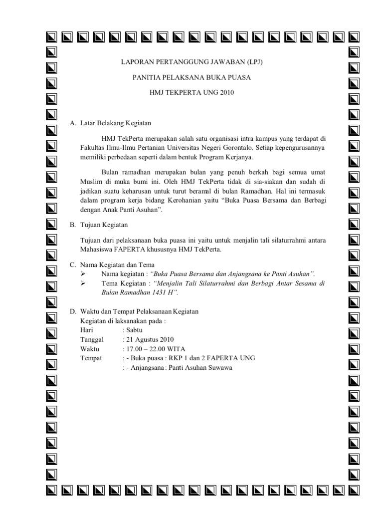 Yang dimulai dari penganggaran pelaksanaan laporan pertanggung-jawaban serta monitoring dan evaluasi melibatkan Perangkat Daerah Pengelola Hibah dan Bantuan Sosial. Contoh laporan pertanggung jawaban lpj bantuan dana desa kata pengantar dengan memanjatkan fuji dan syukur kehadirat alloh swt atas segala rahmat dan karunia nya kami dapat menyelesaikan program kegiatan sebagaimana yang kita harapkan dengan telah selesainya pelaksanaan kegiatan bantuan dana desa tahap 1 tahun 2015.